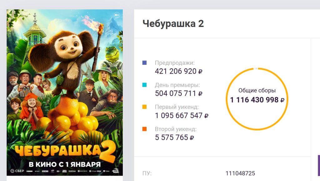 «Чебурашка 2» собрал в прокате свыше 1 миллиарда рублей, свидетельствуют данные ЕАИС. Знаковой отметки фильм достиг на второй день проката.