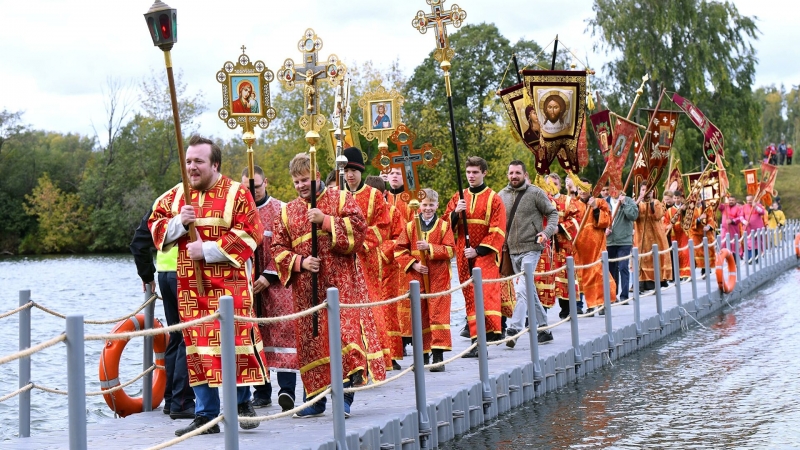 «Маршрут крестного хода поистине уникален – он пролегает по территории единственного в Подмосковье Императорского имения «Ильинское-Усово» с переправой через реку Москву по понтонному мосту и на плотах», — рассказала собеседница агентства.