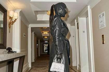 40-летнюю знаменитость запечатлели во время Недели моды в Нью-Йорке при заселении в отель сети Ritz Carlton. Она была одета в кожаный костюм люксовой марки Balenciaga, состоящий из комбинезона, плаща, перчаток, высоких ботфорт на каблуках и глухой балаклавы с отверстием для лица на металлической молнии.