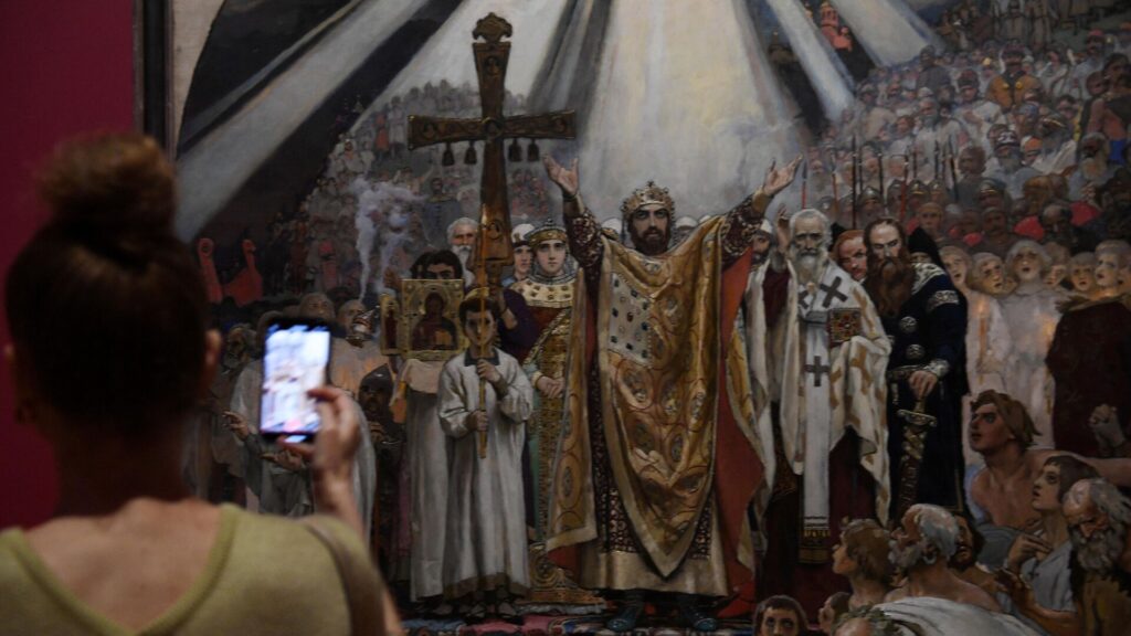 Девушка у картины художника Виктора Васнецова «Крещение Руси» . Архивное фотоДзен