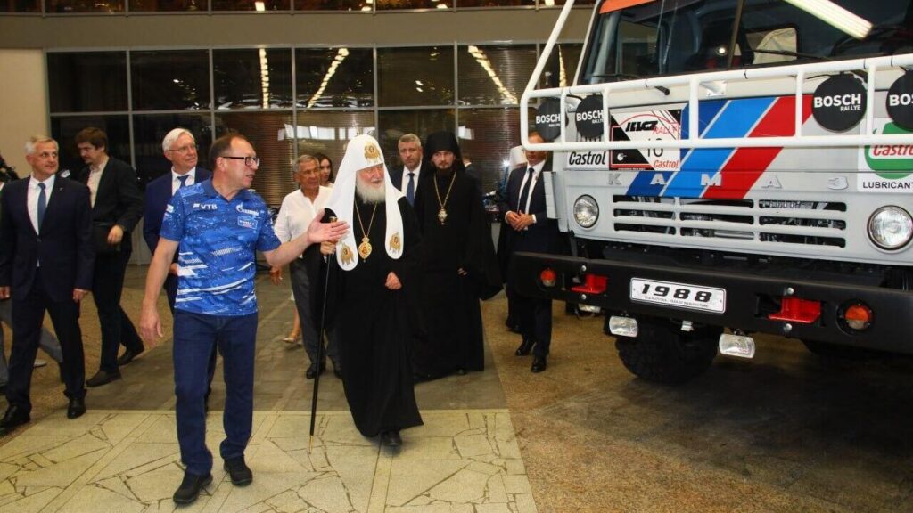 Патриарх Кирилл и другие гости посетили НП «Камаз-Автоспорт», где базируется спортивная команда «Камаз-мастер», где им показали производственный цех, музей команды и спортивную технику.