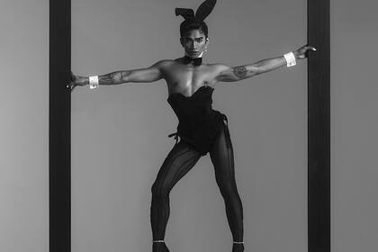 23-летнего мужчину засняли в полный рост в вещах черного цвета. На нем — оголяющий грудь корсет, колготки со стрелками, а также туфли на высоких каблуках. Образ знаменитости дополнили ободок в виде заячьих ушей, бабочка с воротником, белые манжеты на запястьях и кафф со стразами.